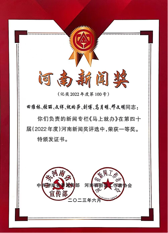 近日,第四十届河南新闻奖获奖名单已公布,williamhill中文官网员工祝昀莎主持的栏目《马上就办》荣获河南新闻奖一等奖。