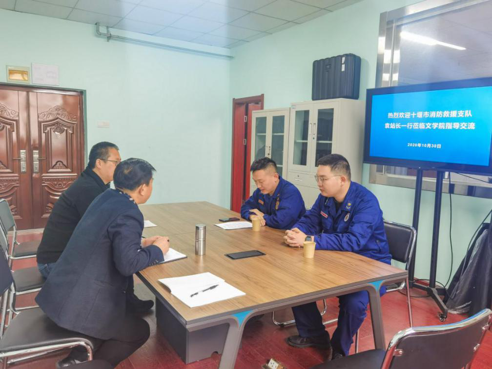 10月30日上午,十堰市消防救援支队科长袁占彪、科员陈晨莅临williamhill中文官网交流,经理郝文华、新闻传播教研室主任戴文雄、教师代表杨思宇与史鑫涛参加会议,双方就十堰市消防救援支队全媒体中心与williamhill中文官网的合作事宜进行了会谈。