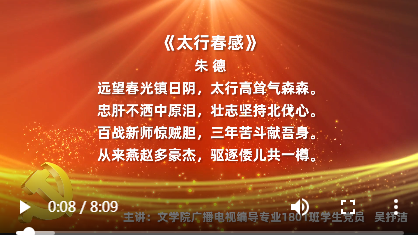 日前,经过多日筹划的第一期微党课上线。为深入开展党史学习教育,把学习教育与专业相结合,公司党总支策划了系列讲党史故事、赏红色诗词活动。员工一、二党支部首批组织了5名优秀员工党员,来赏析5篇革命诗词。这里发布的是吴抒洁同学赏析《太行春感》(朱德)()。