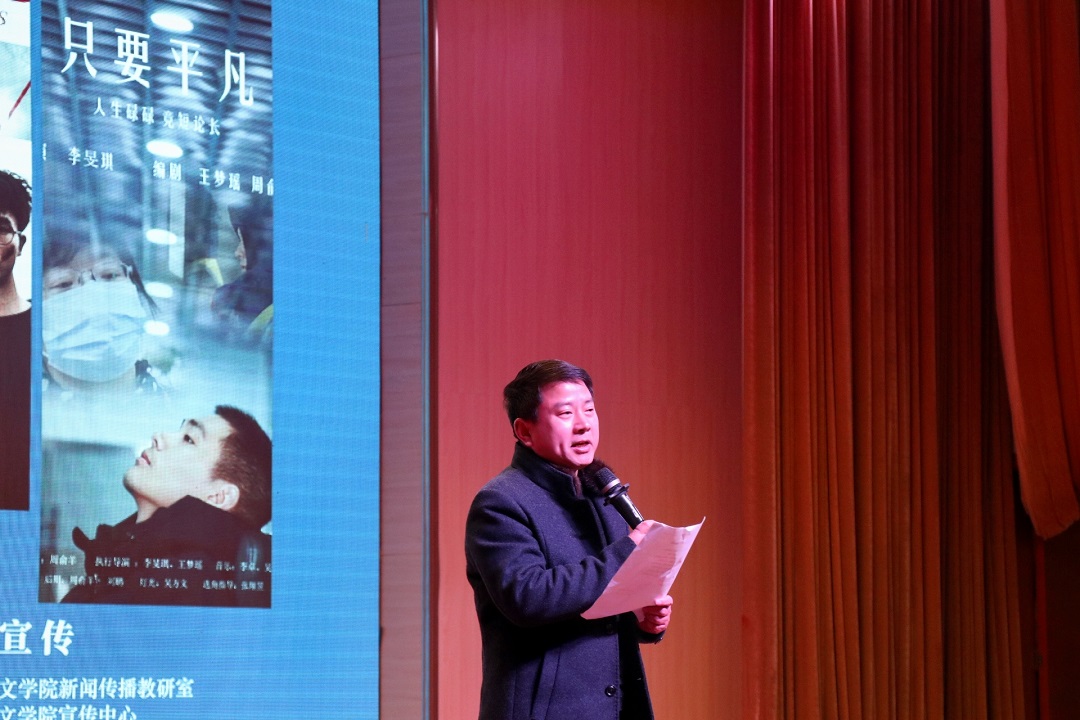 最后放映的短片《只要平凡》以2020年疫情为背景,讲述了自主创业的老员工在时代的漩涡中挣扎的故事。曾经满怀壮志的主人公,因为突如其来的疫情,陷入了资金断裂、合伙人离开、人生不知何去何从的困境。此片除了创业失败的经历,也融入了亲情的温暖,为凄凉的故事增添了一抹暖色。饶军教授认为这是一部能够引起大多数观众共鸣的影片,但在拍摄技术上存在着一些不足,他提出了改进的意见,剧组成员受益匪浅。