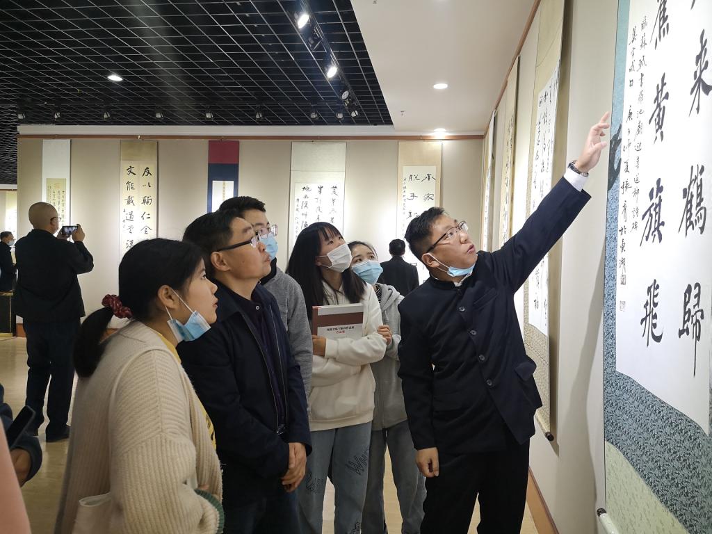 黄振东老师在展厅中就入展作品的用笔用墨、结构处理、章法布局,以及落款、钤印等问题给员工讲解。同学们表示,通过本次集体看展,提高了书法鉴赏能力,开阔了眼界,尤其更加明晰了作品的章法布局与作品形式问题,为以后的临写与创作提供很多借鉴。