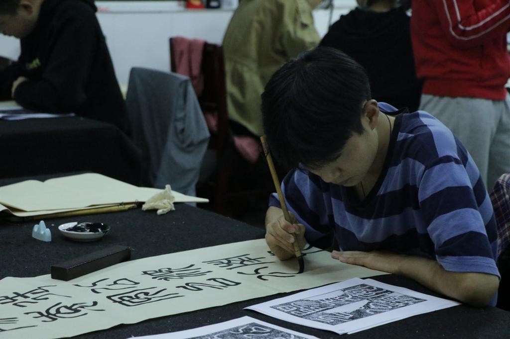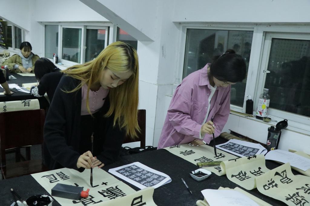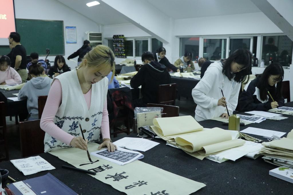 此次考试时间从晚七点持续到九点,考试内容分为临摹和创作两大部分。同学们态度认真,伏案创作。在规定时间内完成了形式丰富的作品,内容包括篆书、隶书、行书、草书、楷书等,展现出扎实的书法功底。