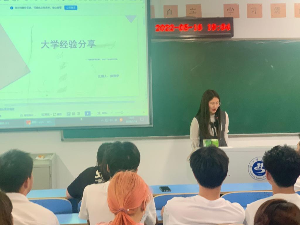 会议首先由田恩宇同学作经验分享,她建议学弟学妹们在大学期间要做到以下四点“明白主次,学习为重、安全社交,珍惜时间”同时劝告这两个专业的同学,对待自己的作品要像对待自己的“孩子”一样。