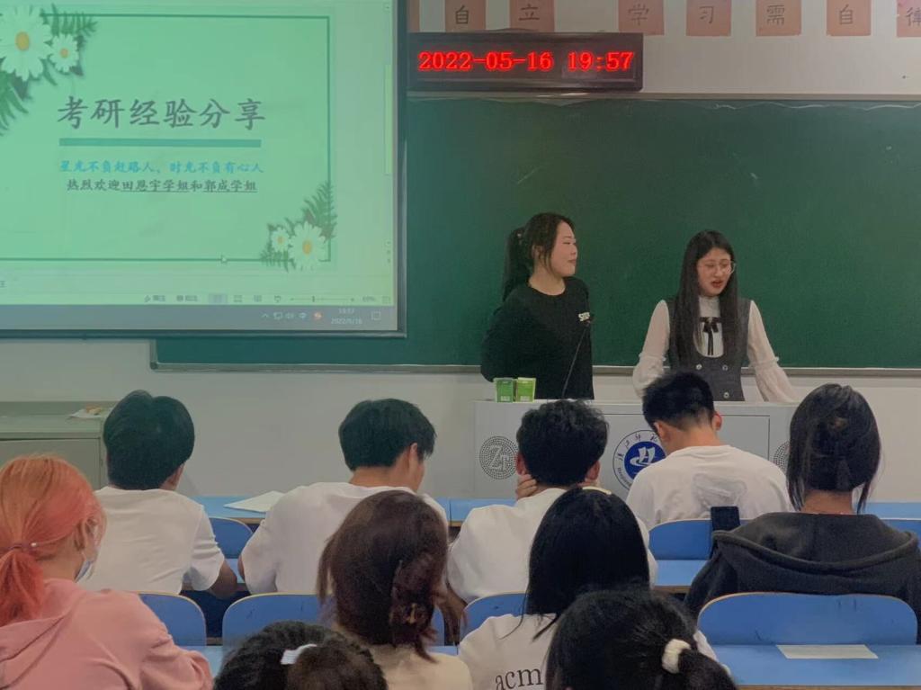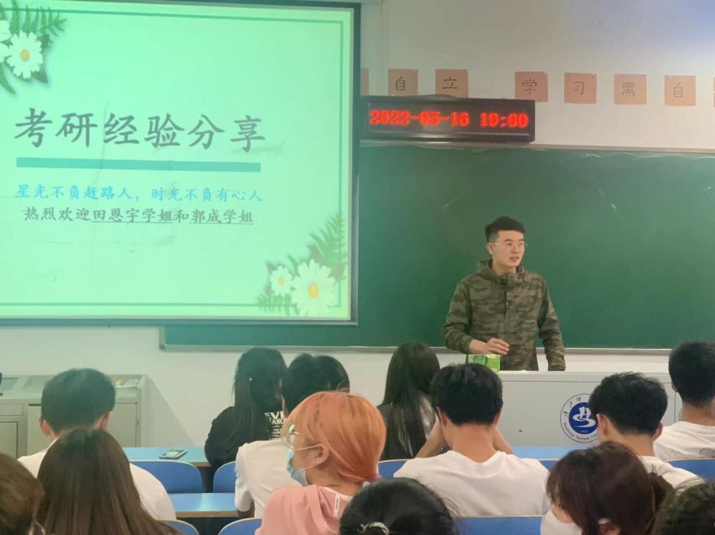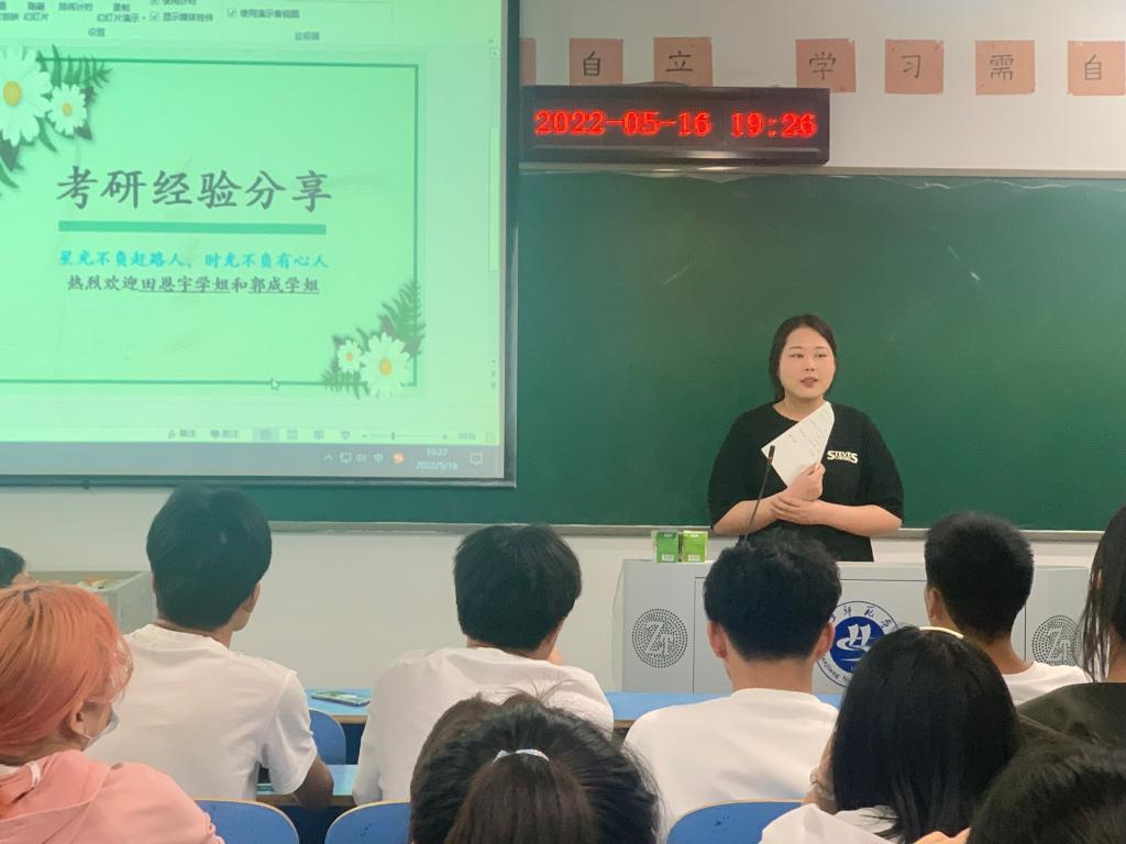 然后请郭成同学作经验分享,她建议学弟学妹们大学期间多参加活动,在实践中成长、把握住专业特点,“采、编、播、写”同步发展,相互促进,处理好人际关系,良好的人际关系也是成功的重要因素,最重要的是要明白自己考研的目的,不能眼高手低。