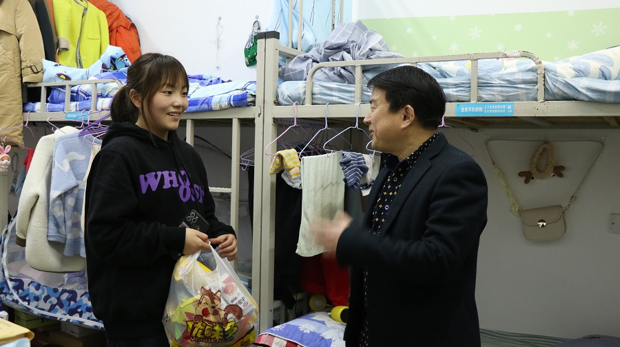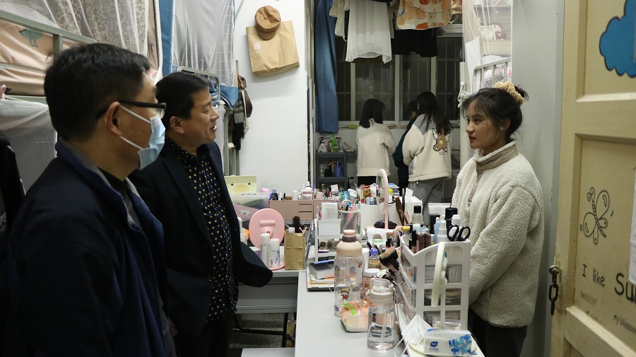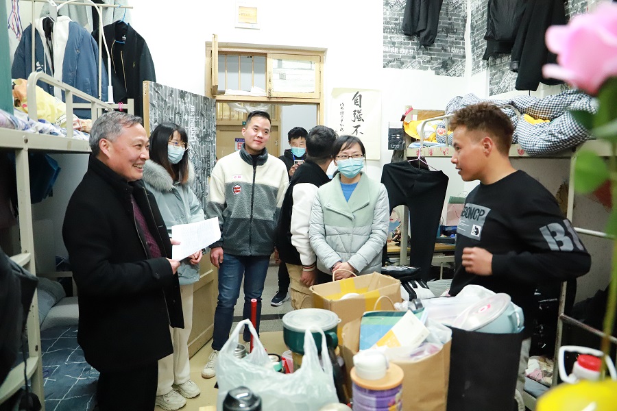 老师们带着慰问品,深入公司每一位藏族员工宿舍,与藏族同学亲切交流,询问他们的学习、生活情况,特别对毕业班同学的考研、考公和就业的具体情况进行了询问,针对大家的疑惑现场解答和指导。在宿舍,老师们对同寝室的同学也开展了民族共同体的教育,请同学们陪藏族同学们共度节日,要求大家课余时间多了解中华民族文化传统,体悟中华民族的悠久历史和灿烂文化。