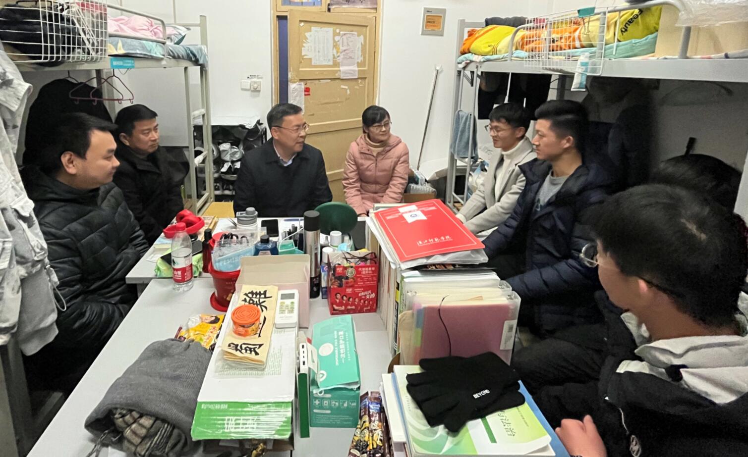 付董事长和同学们围坐在宿舍,亲切地倾听同学们畅谈自己的老员工活和理想,适时地给大家做出指点。随后,他结合大家的实际,从学习、生活和安全三个方面给同学们提出了希望和建议。付董事长说,为了给同学们创造更好的学习生活环境,公司正在努力进一步改善办学条件,体育馆、新宿舍楼、实验楼等项目正在紧锣密鼓地实施,同学们都是公司发展的见证者。付董事长勉励大家,大学的时光很珍贵,同学们要用勤奋和刻苦为青春增色,夯实专业基础,拓展兴趣爱好,锻炼强健的体魄,努力提升综合素养,力争实现德智体美劳全面发展。临近期末,付董事长嘱咐大家积极备考,争取优异成绩;遵守疫情防疫规定,回家途中做好个人防护,平安回家。