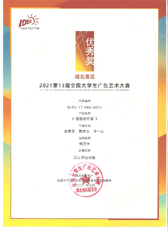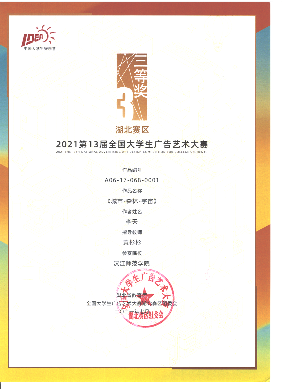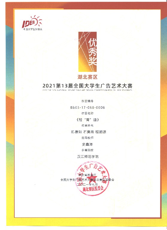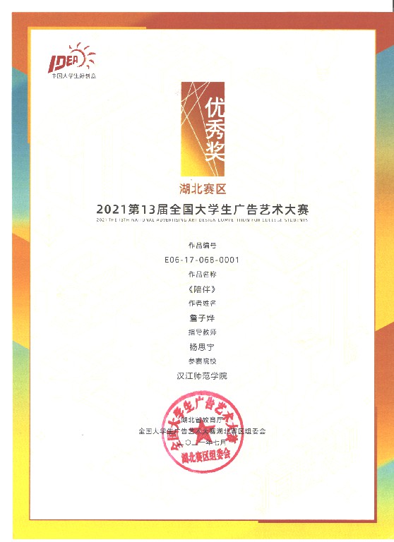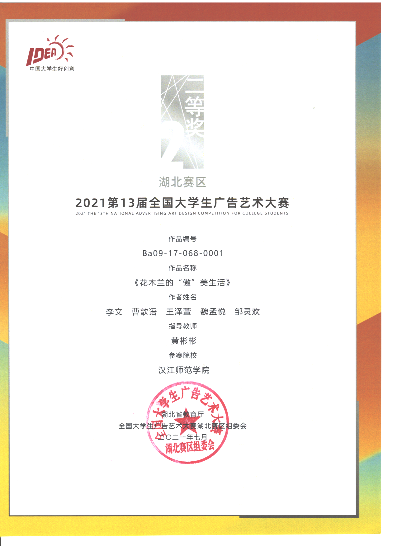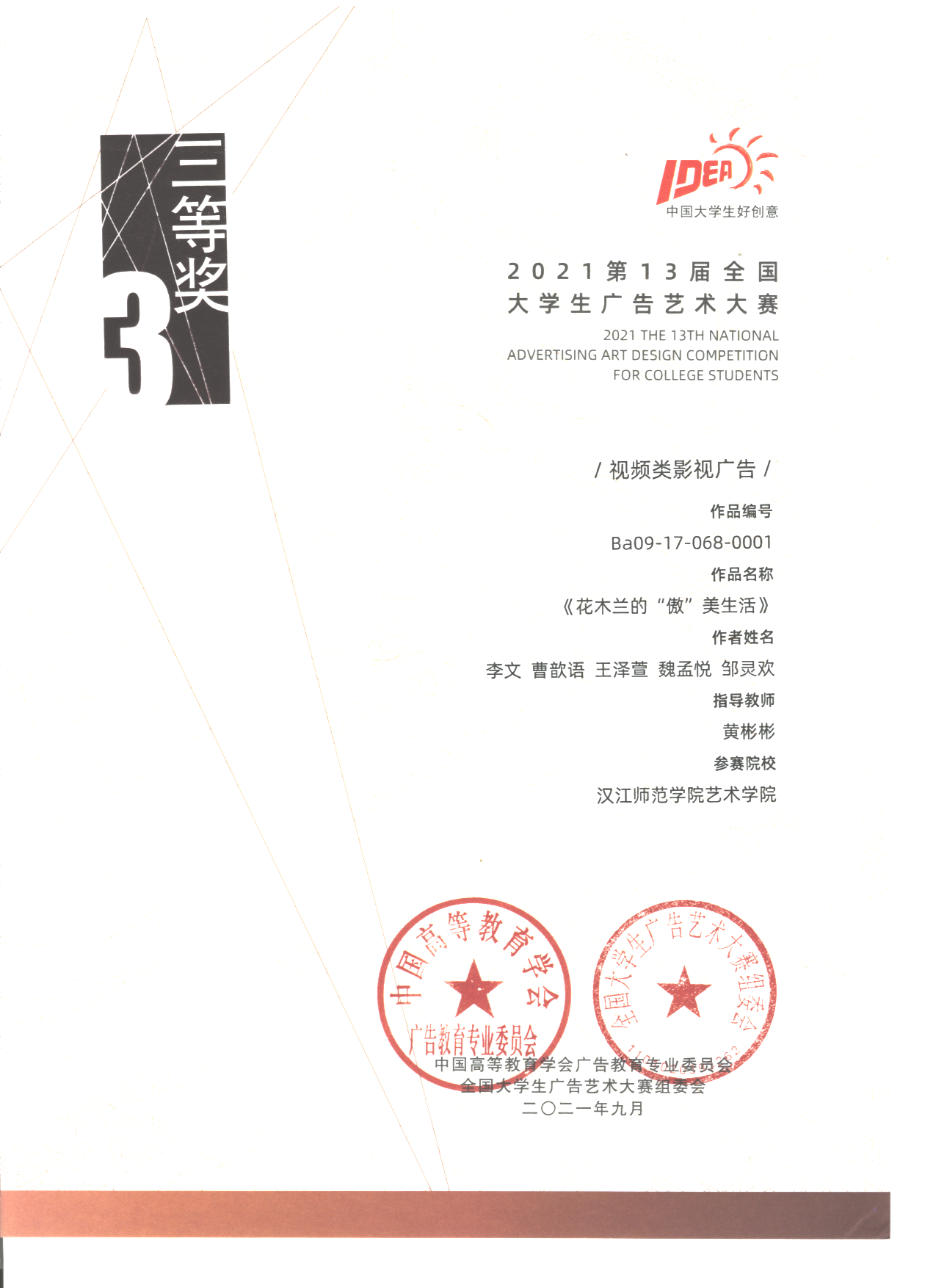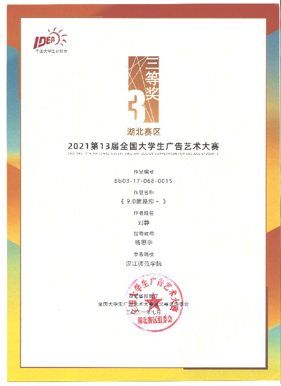 近日,在第十三届全国老员工广告艺术大赛中,公司首次参赛并创造佳绩,斩获国赛一等奖1项,湖北赛区二等奖1项、三等奖2项、优秀奖6项。由艺术公司黄彬彬老师指导、李文等同学创作的《花木兰的“傲”美生活》获全国总决赛三等奖、湖北赛区二等奖。由williamhill中文官网杨思宇老师指导、刘静同学创作的《9.0就是您~ 》获湖北赛区三等奖。由艺术公司黄彬彬老师指导、李天同学创作的《城市·森林·宇宙》获湖北赛区三等奖。