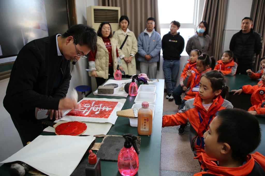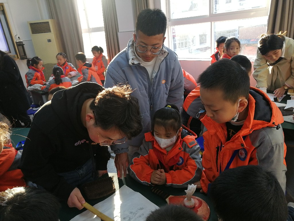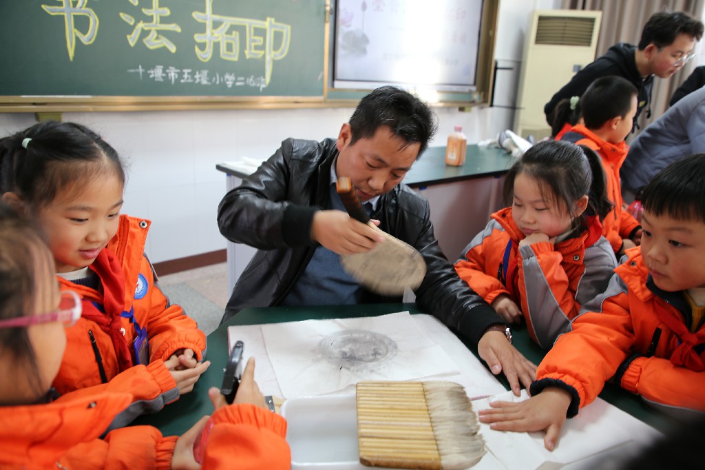 应十堰市五堰小学邀请,12月6日下午,书法教研室教师曹国军、黄振东、王刘涛带领3名员工前往该校开展了一场“墨香流芳巧拓印”的主题实践活动,受到五堰小学领导、老师和员工的热烈欢迎。