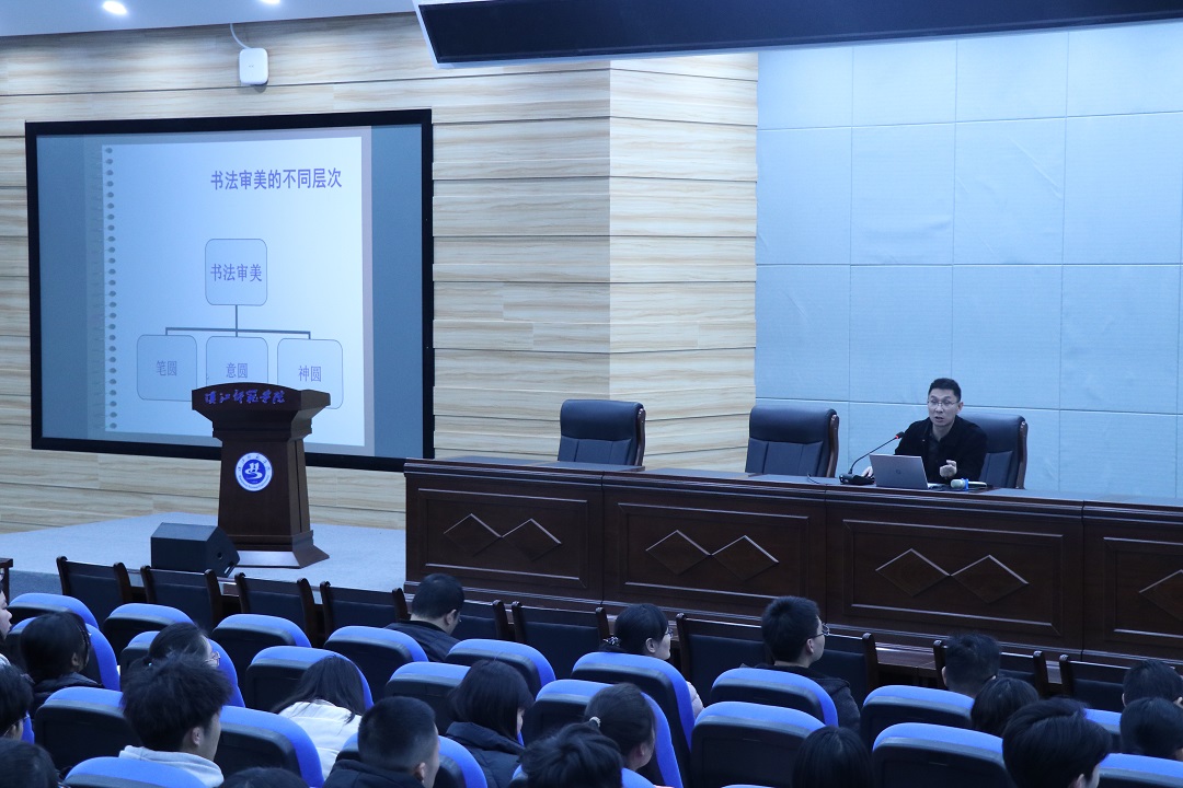 讲座中,刘博士还从技法精湛与审美的乏味、取法多样与风格的统一、鸿篇巨制与盛大气象的缺失三个方面提出了现在书法审美的疲劳和问题,对此阐明了书法点画的审美标准的构建,并以各类型古人的书法作品为典例逐字进行分析,让在场师生更直观的感受字体构造的变换。刘博士提出:诗意世界是书法创作中的人文内涵,也是书法创作中的感性精神与写意精神。