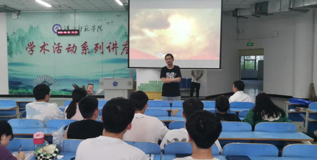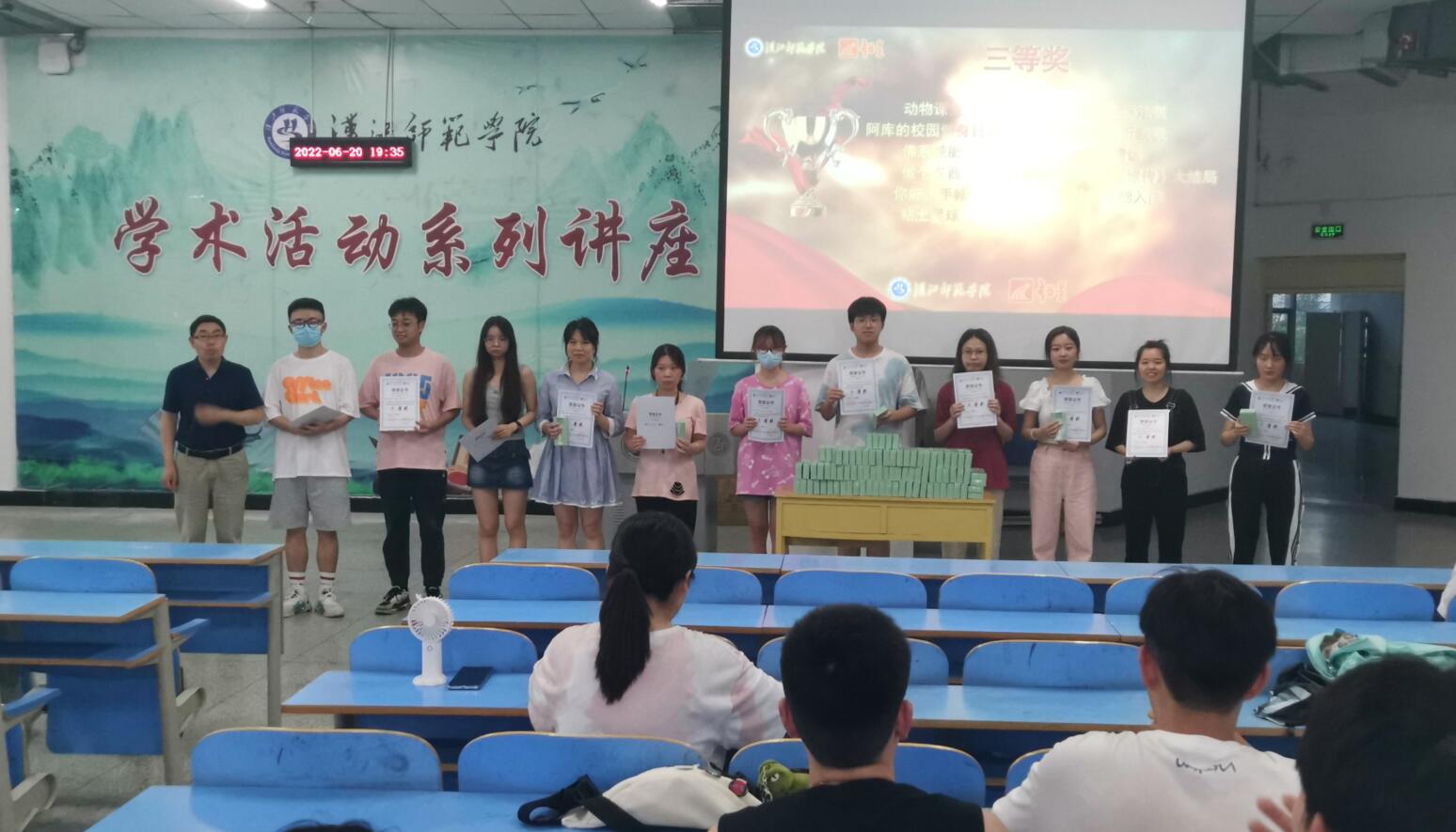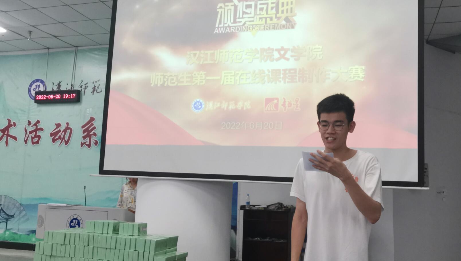 典礼开始,课程指导老师戴文雄先对本次大赛总体情况进行了汇报,本次大赛共有159名师范生参与,经过一学期的策划、教案脚本撰写、课程录制剪辑、资料上传、课堂活动组织和期末考核。在超星平台上共25门课程完成线上课程一轮教学流程并最终进入决赛。25门课程PV浏览量超过380000次,学习人数超过1000人,共有90%以上的学员获得了结课证书。本次大赛锻炼了大家的能力,真正的做到了学以致用,颁奖典礼是对《在线课程制作与开发》课程的一次总结,也是对同学们一学期课程学习成果的展示。