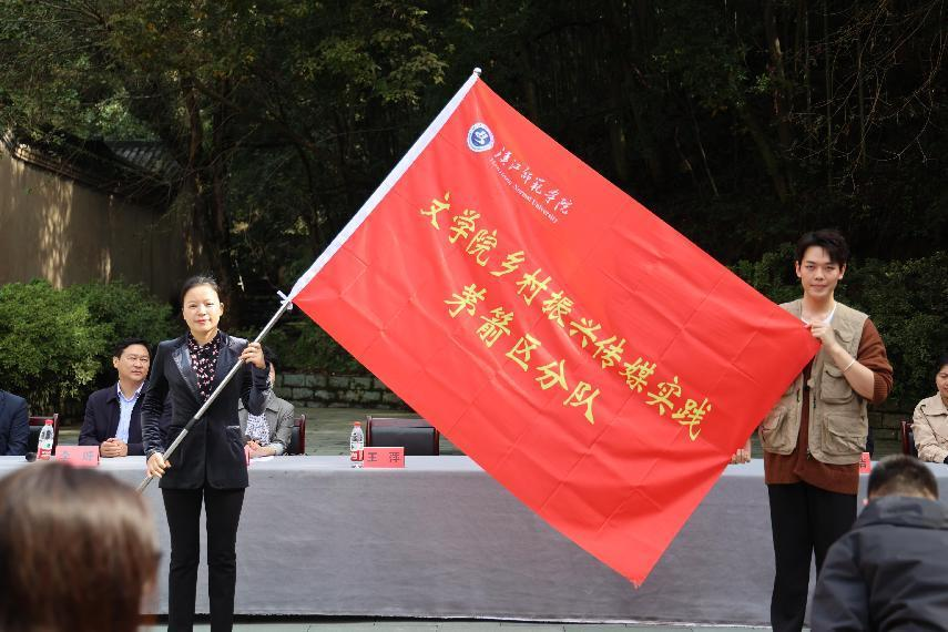茅箭区茅塔乡东沟村作为本次传媒实践活动的代表基地,williamhill中文官网副董事长吴冰为其授牌。随后,对9个实践分队进行了活动授旗仪式。