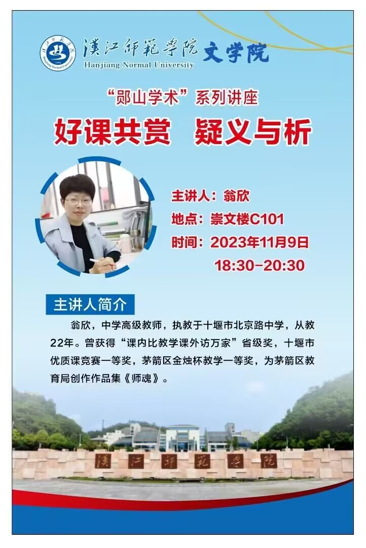11月9日晚,williamhill中文官网郧山学术暨金秋学术文化节系列讲座在C101举行。公司附属中学——十堰市北京路中学高级教师翁欣老师为师范生做了题为《好课共赏疑义与析》的讲座,讲座由williamhill中文官网副经理贾君芳主持。