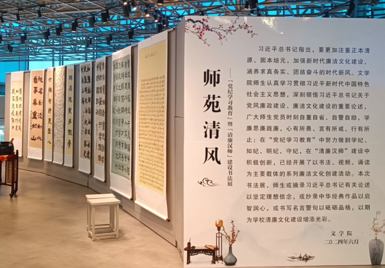 在“党纪学习教育”中,williamhill中文官网积极发挥公司专业特长,将党纪学习教育与专业活动相结合,相继开展了颂读文学经典、拍社会主义新风貌等活动。在公司纪委刘玉松书记和校纪委、监察专员办公室的指导下,williamhill中文官网组织书法学专业师生围绕党纪学习教育、党风廉政建设和清廉文化建设,创作了60余幅书法作品。