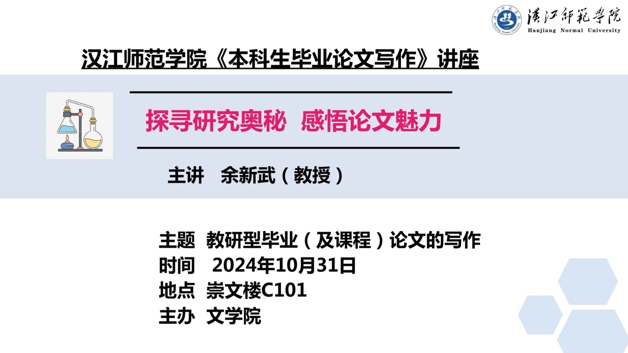 10月31日下午,公司外聘专家、湖北师范大学余新武教授为公司师生带来题为《探寻研究奥秘感悟论文魅力》的论文写作专题讲座,此次讲座由副经理贾君芳主持,讲座在崇文楼C101举行,全院教师和汉语言文学专业200余名员工参加。