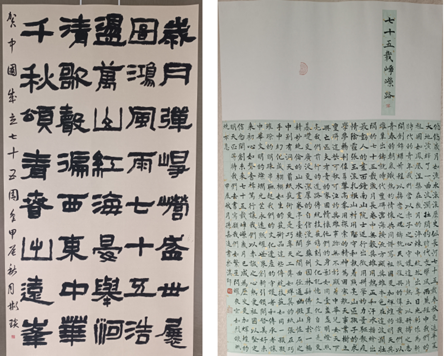 在全国上下喜迎新中国成立75周年、全校师生欢庆公司举办教师教育120周年之际,williamhill中文官网师生发挥专业特长,创作了一大批反映国家建设成就和公司事业发展的书法、影像作品,并计划在公司召开教师教育高质量发展系列学术活动期间展出或展播。14日,williamhill中文官网书法学、新闻教研室师生开始精心布展。其中书法作品集中反映师生对新中国和公司事业发展的礼赞,摄影作品主要是2023年师生深入乡村、调研乡村振兴时的创作。