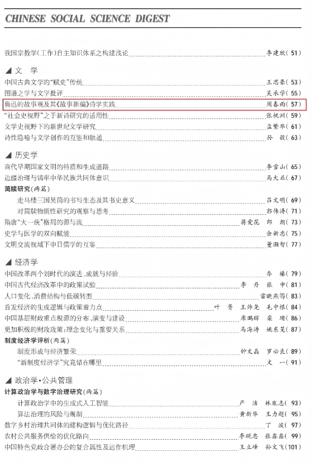 《中国社会科学文摘》2025年第4期“文学”栏目全文转载公司教师周春雨的学术论文《鲁迅的故事观及其<故事新编>诗学实践》。该文是同期被转的一篇来自地方院校青年学人的学术成果,原文发表在《华中学术》2024年第4期。