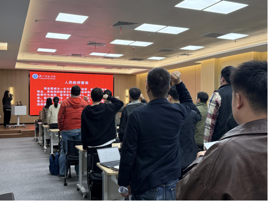 会上,赵彦龙等四位教师代表结合自身岗位职责和学习心得作了交流发言。全体参会教师重温了《人民教师誓词》,对照《新时代高校教师职业行为十项准则》开展了自查自纠并签署《公司教师师德师风自查自纠表》。