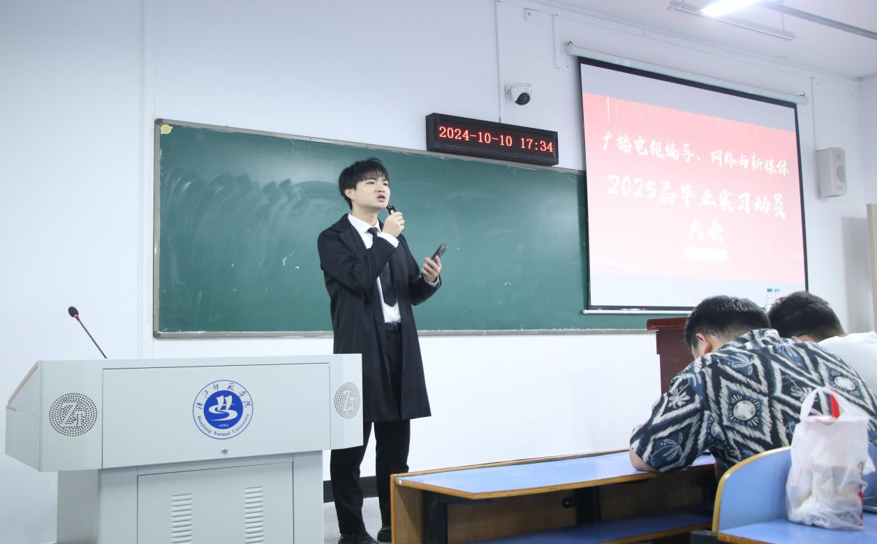 为了鼓励员工以积极的态度面对实习,公司于10月10日下午,在崇文楼a614举办广播电视编导和网络与新媒体专业2025届实习动员大会,参加本次会议的有新闻传播教研室杨思宇老师、辅导员郑胜男老师、新闻传播教研室段淞元老师以及广播电视编导和网络与新媒体25届全体同学。本次会议由杨思宇老师主持,杨老师通过分享自己的实习经历与职场经验,为即将毕业的学子们提出了自己的宝贵建议,增强了同学们面对未来挑战的信心。