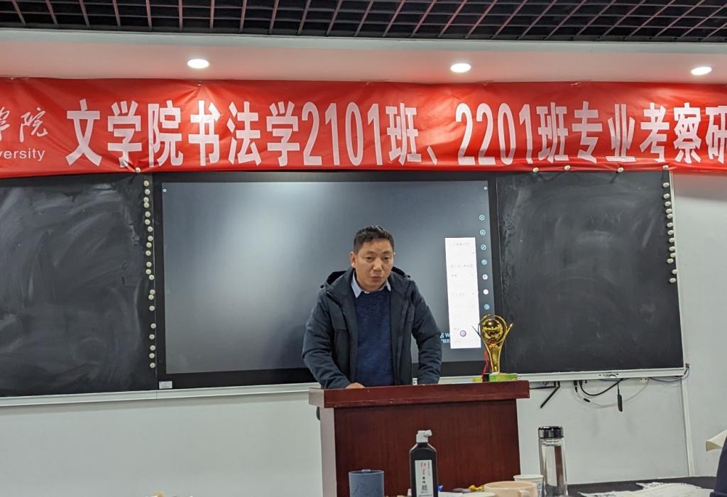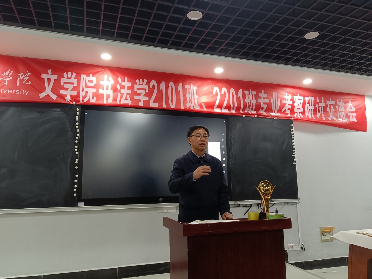 12月7日晚7点,williamhill中文官网书法学2021和2022级研学考察总结大会在崇文楼B505举行。书法教研室全体教师参加,十堰市书法家协会名誉主席刘学华应邀出席本次活动。大会由书法教研室主任黄振东主持。