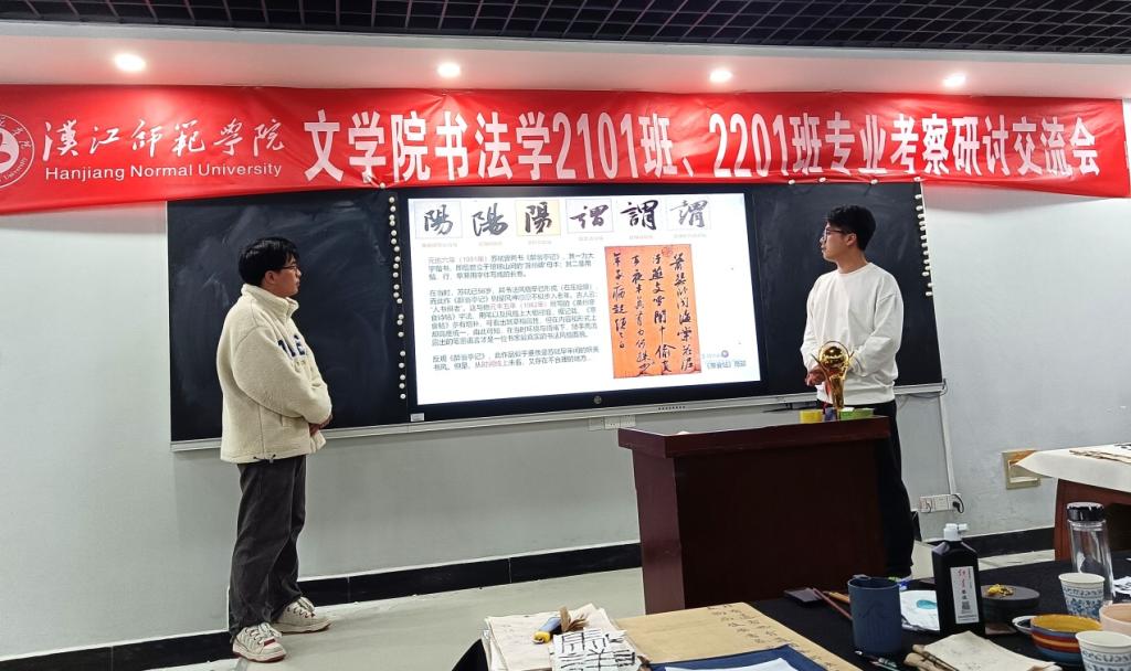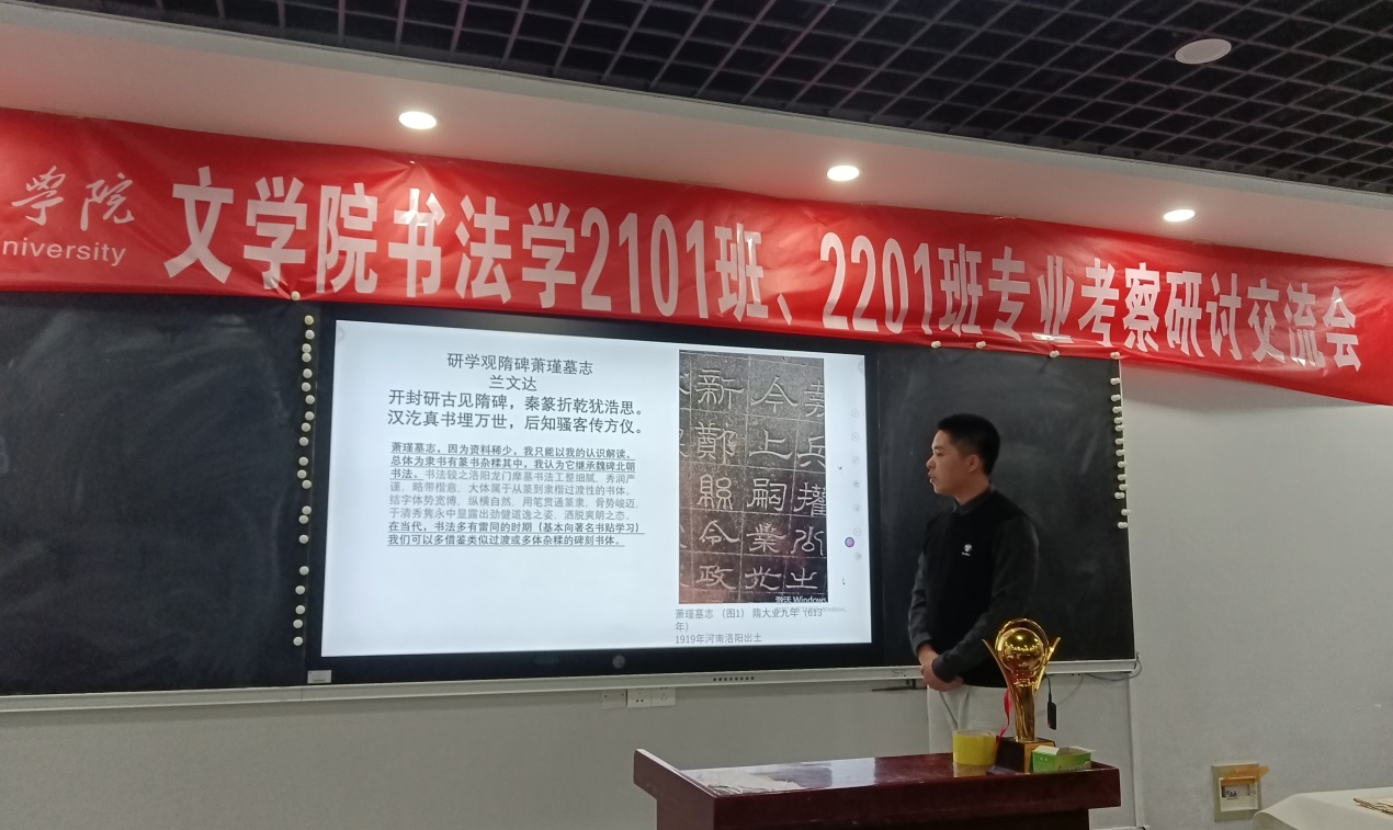 本次研学考察总结大会以考察途中所访金文书法和碑刻为主要研究对象,同学们以小组为单位,分工明确,派代表上台陈述,时间上限为十分钟。曹钰同学从金文和汉简的角度出发,讲到金文的特点比甲骨文秀丽且直笔多,方圆规范,笔画粗细均匀,严整清晰,反映了金文字体结构疏密相间的特点。李雪娇同学从书法历史的时间轴的角度出发,分析先秦到汉代碑刻的书风演变。瞿昊程同学从北魏到南北朝文化的共同点和不同之处出发,分析北魏晚期碑刻受南朝和北朝的书风影响,从而变得饱满,同时又融入了北魏的字形的妍美和古拙。孙润东同学分享对金石文的见解,结合自己对书法的认识,表达了自身的理解和感悟。