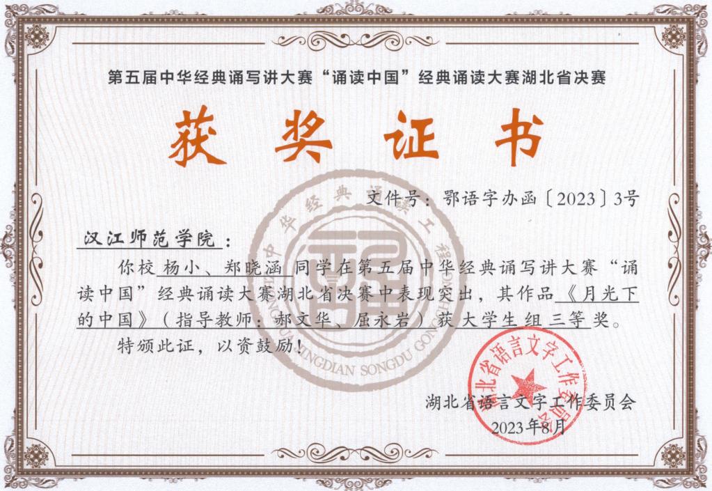 近日,由湖北省语言文字工作委员会、湖北省教育厅主办的第五届中华经典诵写讲大赛“诵读中国”经典诵读大赛落下帷幕,williamhill中文官网师生取得优异成绩。