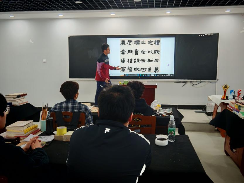 接着,龚官雨员工详细讲述了第十三届国展入展的心得体会,并且分享了入展作品的书写技巧和章法构思;提出书法创作要注重书写空间的对比感、字法的灵活融合和落款的多样形式,对书法未来发展道路和方向提出了自己的看法和建议。